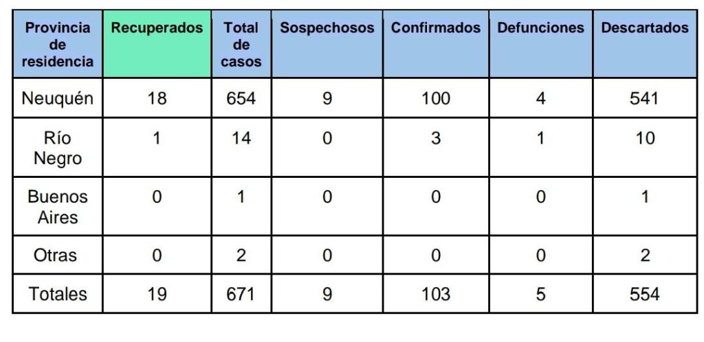 Coronavirus: Neuquén sin nuevo caso, dos recuperados uno de Cutral Co otro de Centenario
